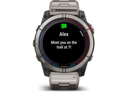 | Kui su käekell ja telefon on omavahel ühendatud, saab su reaalajas asukoha saata sõnumiga su kontaktidele käsitsi või – valitud välitegevuste ajal – automaatselt sisseehitatud juhtumituvastusfunktsiooniga5. | Laadi alla eri kellakuvasid, lisa andmevälju ning hangi rakendusi ja vidinaid Connect IQ poest ühilduvas nutitelefonis. |