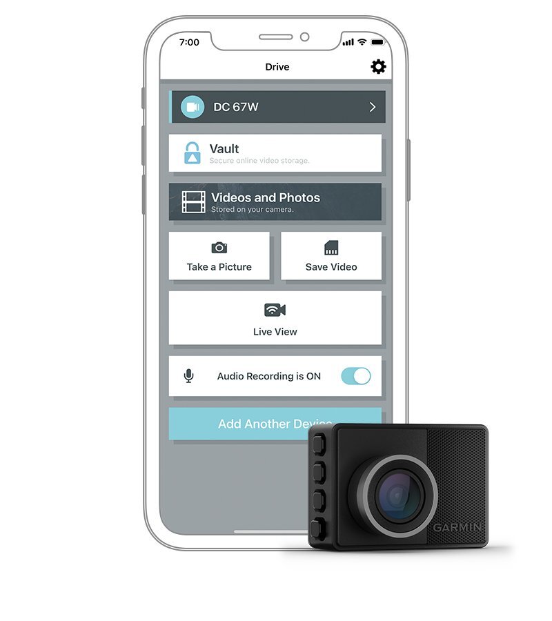 | WiFi-ühenduse kaudu saad teistega videoklippe jagada, kui saadad neile lingi ja pääsukoodi. Turvalisse veebihoidlasse salvestatud videotele pääsed juurde ühilduva nutitelefoni rakenduses Garmin Drive. | Garmin Drive’i rakenduses saab hallata ja esitada sünkroonitud videopilti kuni neljast Garmin pardakaamerast (müüakse eraldi), mis paiknevad autos eri kohtades ja jäädvustavad videopilti eri vaatenurkadest. |