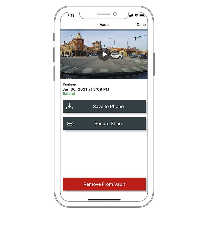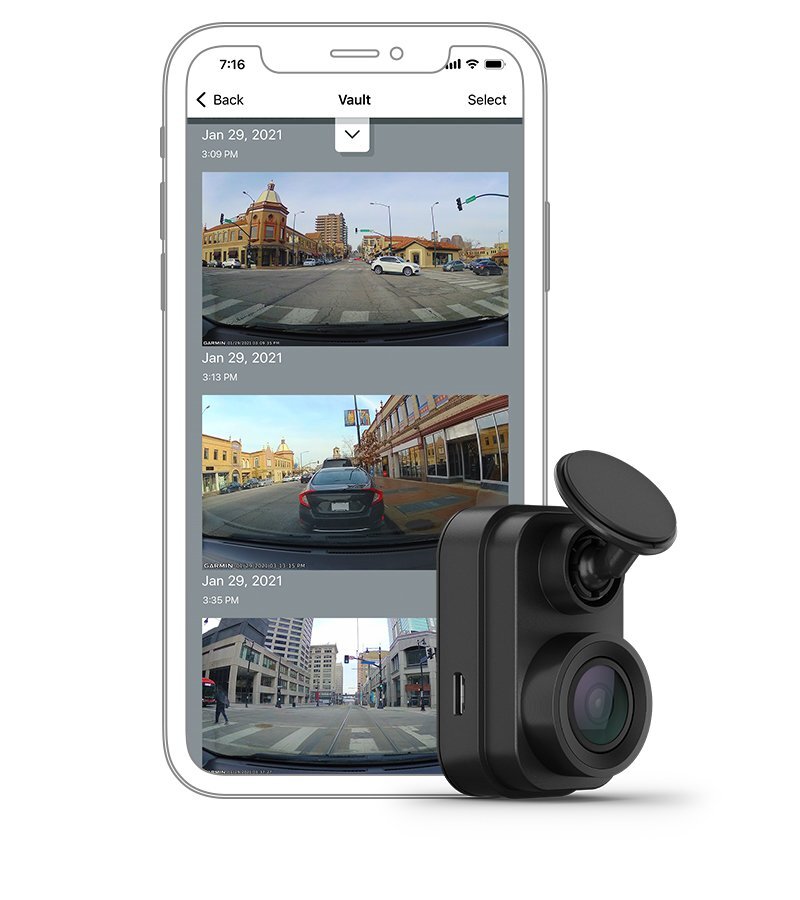 | Juhtumi tuvastamisel salvestab kaamera automaatselt juhtumieelse, -aegse ja -järgse videopildi, et anda ülevaade kogu sündmusest. | Hoia käed roolil ja kasuta häälkäsklusi, et paluda kaameral video salvestada, heli salvestamist alustada ja peatada, pildistada jne. Saadaval inglise, saksa, prantsuse, hispaania, itaalia ja rootsi keeles. | Salvestatud videod talletatakse turvaliselt veebihoidlas ning neile pääseb juurde ühilduva nutitelefoni rakenduses Garmin Drive™. Wi-Fi®-ühenduse kaudu saad teistega videoklippe jagada, kui saadad neile lingi ja pääsukoodi. |