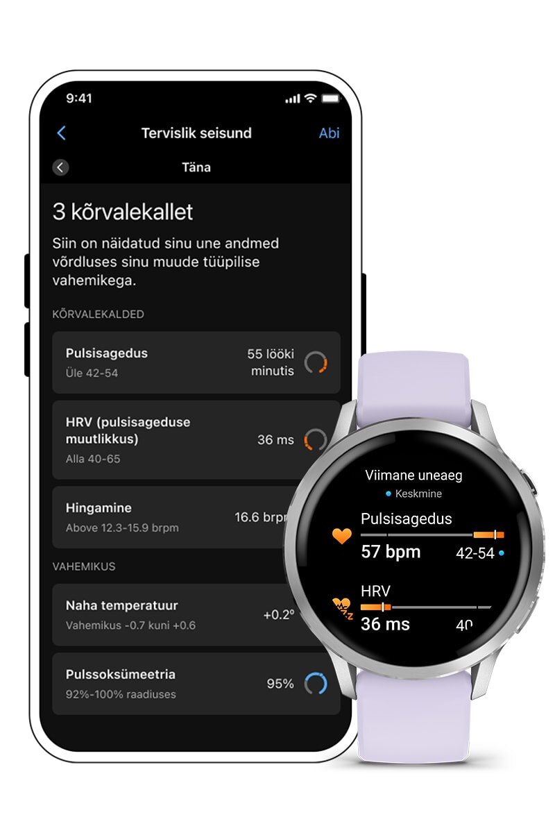 Saavuta edu tervislikuma elustiili poole pürgimisel mitmekülgsete tervise jälgimise funktsioonide abil, näiteks Body Battery™ energiataseme jälgimine, stress, pulssoksümeetria1 ja naiste tervise jälgimine (sh möödunud ovulatsioonide prognoosid2) jm3. Saa uneskoor ja personaliseeritud juhendamine selle osas, kui palju und vajad ja kuidas saaksid oma und parandada. Jälgi isegi erinevaid unefaase ja uinakuid ning vaata põhinäitajaid nagu HRV-olek ja naha temperatuur 3, et oma tervist paremini mõista. Lisaks saad une ühtlustamise funktsiooni abil välja selgitada kooskõla sinu ööpäevase rütmiga ja vaadata oma une järjepidevust. Pane tähele, kui sinu tervisenäitajad – nagu pulsisagedus, HRV, naha temperatuur3 ja pulssoksümeetria1 une ajal – on väljumas su tavapärastest vahemikest, mis võib anda tunnistust keha lisandunud stressist. Need muutused võivad olla seotud füüsilise koormuse, keskkonna, stressi, alkoholitarbimise, võimaliku haigusega jm (saadaval beetaversioonis4).