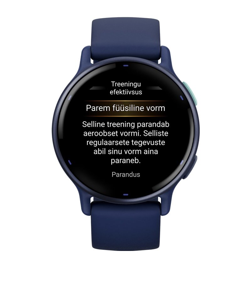 | Vaata hinnangut sellest kui heas vormis sa võrreldes oma tegeliku vanusega oled. | Loo Garmin Connecti rakenduses samm-sammult treeninguid enam kui 1600 harjutusest ja saada need otse oma kella. | Kuula otse kellast jooksmis- ja kõndimistegevuste helijuhiseid. |