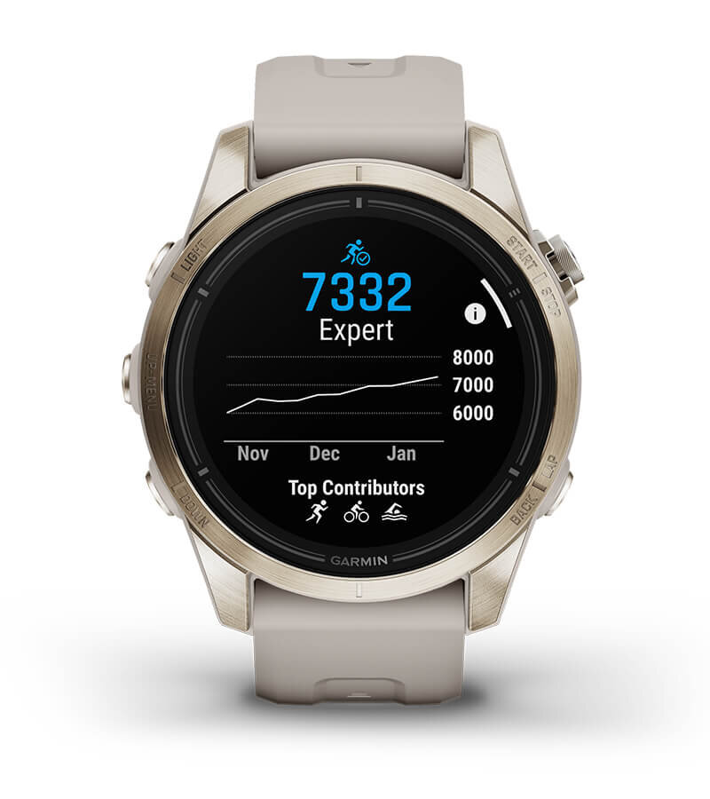 | See funktsioon, Mõõdab sinu vastupidavust pikemate jõupingutuste ajal ja ühendab kõigi sinu sportlike tegevuste treeningandmed, et aidata sul mõista, kuidas treening sinu üldist vastupidavust mõjutab. Dünaamilised mõõteandmed kasutavad sinu maksimaalset hapnikutarbimist, lühi- ja pikaajalist treeningkoormust ning muid tegureid, et jälgida sinu treeningu võtmeaspekte muu kui ainult maksimaalse hapnikutarbimise põhjal. | Vastupidav sportlik disain sisaldab kirgast 1.2″ AMOLED ekraani, puutetundlikku ekraani, tavapäraseid nuppe ning 42mm kiudtugevdusega polümeerist korpust, millel on terasest raam ja tagakaas. Kella on testitud USA sõjaliste standardite järgi termo-, põrutus- ja veekindluse osas. | Sinu tervise- ja treeningandmed peaksid olema kergesti tõlgendatavad ning tagama ülevaate, mille põhjal saab edasi tegutseda. Alusta igat päeva kohandatava hommikuse aruandega ning vaata igapäevast tervise- ja heaoluandmete kokkuvõtet. Kasuta treeninguvalmiduse funktsiooni, mille abil jälgitakse paljusid erinevaid tervisenäitajaid, mis aitavad sul treeningu tõhusust ja taastumist maksimaalselt ära kasutada1 ning läbipõlemist vältida. |