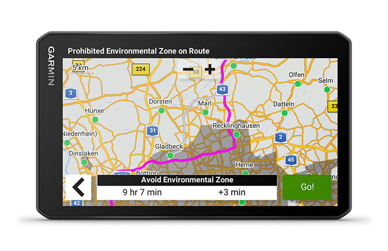 | Saad juhiseid ja hoiatusi keskkonnaalade kohta su marsruudil. | Pead oma veoki parkima? Euroopa veokiparkimiskohtade andmed aitavad sul marsruudil parkimiskohti leida. Võid filtreerida soovitud mugavuste, nagu Wi-Fi®, duširuumid, turvatase jne alusel. Ja kui sul on ühendus mobiilirakendusega Garmin dezl™, vaata järgi, kas vabu parkimiskohti on, et sa ei sõidaks parklasse asjata. | Leia eelistatud veokipeatuskohti eellaaditud veoki- ja haagiseteenuste kataloogist. See võimaldab loendeid kaubamärgi ja mugavuse alusel filtreerida. |